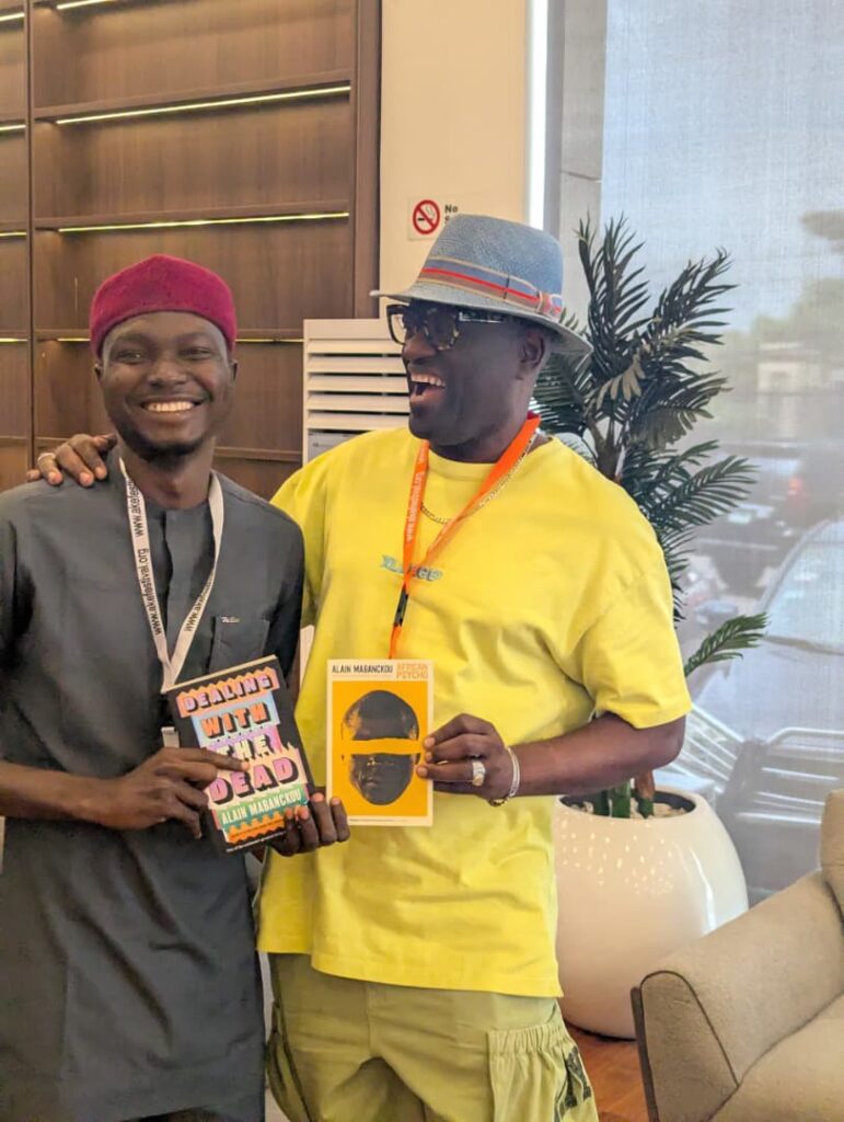 (L-R) Alain Mabanckou and Ahmad Mubarak Tanimu posing with Mabanckou’s Dealing with the Dead and African Psycho
