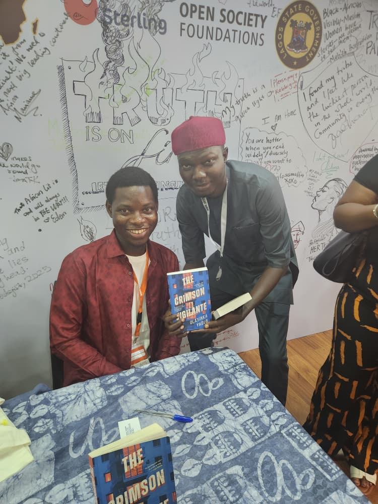 The combined book chat filled the hall to the brim; many had to stand, and the audience followed the conversation on stage with palpable energy. It was no wonder, then, that The Crimson Vigilante had sold out even before the event began. There is a generational gap between Kayode and Yaqub, and Chinenye Igbudu, spotting this, asked the former to advise the latter on how to keep soaring. “Generosity,” answered Kayode, “is the most important thing that will keep you going.” Impressed by Yaqub’s outing on stage, the distinguished Nigerian writer and artist Abdulkareem Baba Aminu declared himself a fan and offered words of encouragement to the “Star Boy” of the festival.