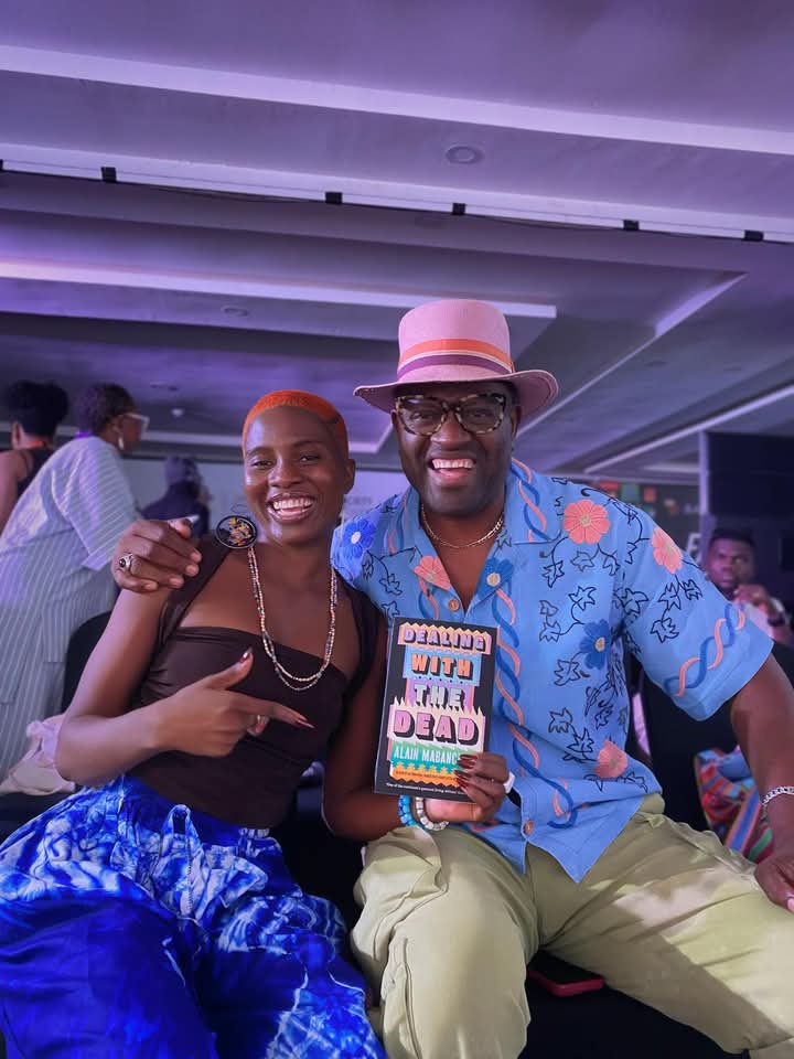 (L-R) Evidence Egwuono Adjarho and Alain Mabanckou posing with Mabanckou’s Dealing with the Dead
