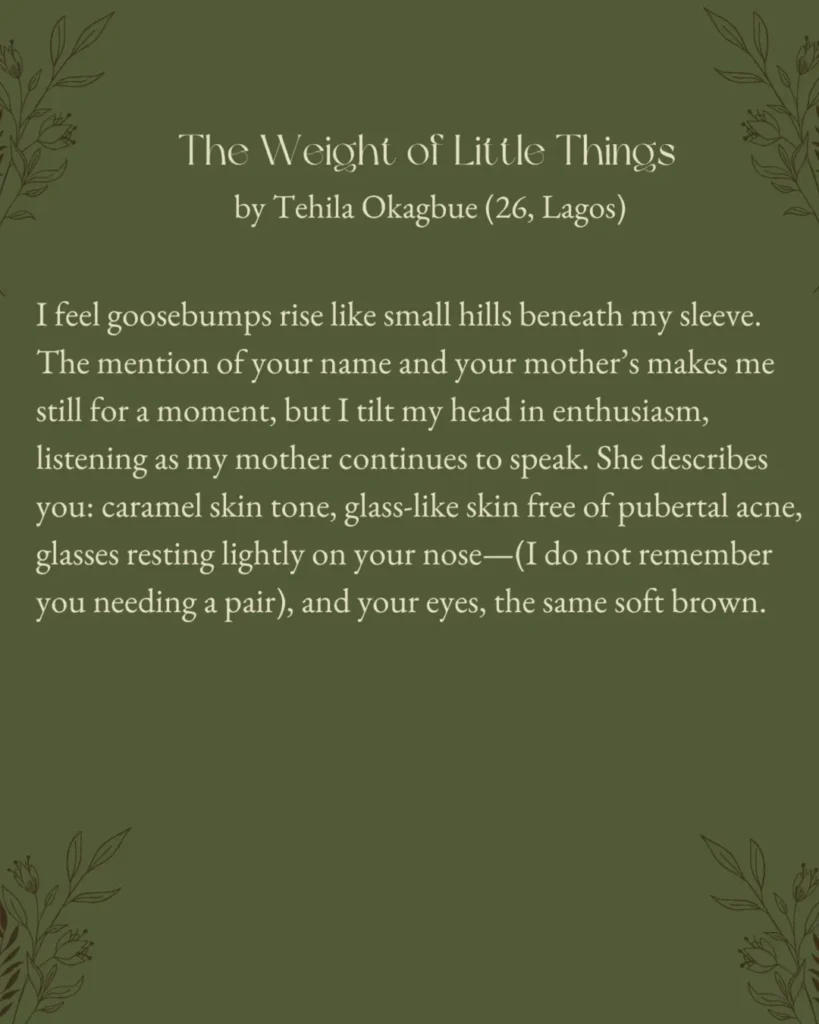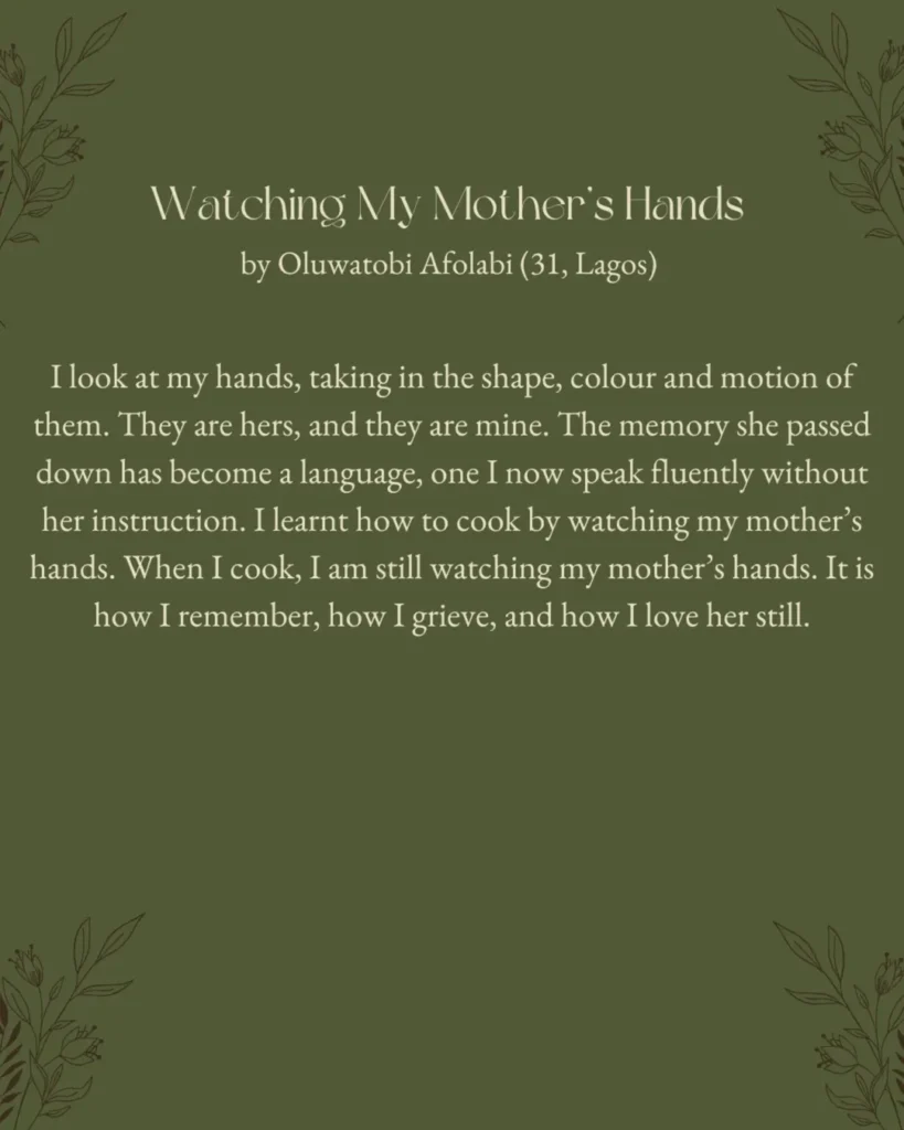 • Watching My Mother’s Hands by Oluwatobi Afolabi