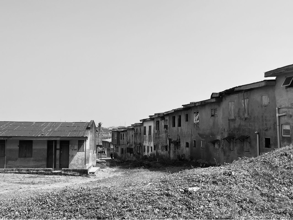 These structures tell a story I’ve been wrestling with – how spaces built for learning become monuments to broken promises. Moving beyond the corridor, I encounter two parallel building blocks facing each other across empty ground, their windows march in perfect formation – small, identical, efficient. The space between them feels too wide and too quiet. This is architecture designed for crowds, now hosting only wind. The modernist lines are still there, clean and purposeful. The optimism that went into these designs is still obvious, the belief that good architecture could help build a better Nigeria.
